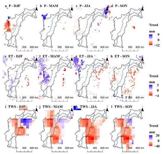 Seasonal trend magnitude: (a–d) precipitation (), (e–h) evapotranspiration (), and (i–l) terrestrial water storage change (), and their magnitudes over the Sao Francisco Basin. DJF = December, January and February; MAM = March, April and May; JJA = June, July and August; and SON = September, October and November. Trends were assessed using the Mann−Kendall and Theil–Sen’s slope estimator at 0.05 of the significance level. White color means a nonsignificant trend.