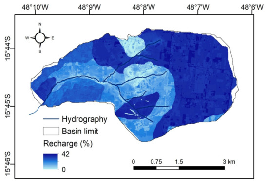 Estimated spatial distribution of effective groundwater recharge in the study area based on numerical modeling (% annual precipitation).