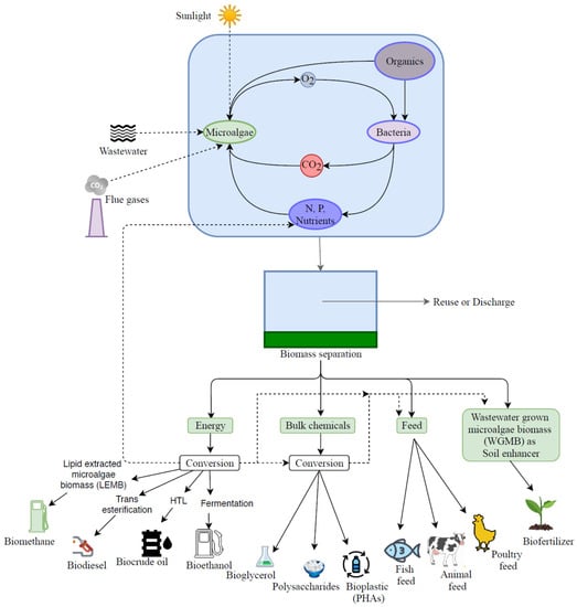 Conventional wastewater treatment plants (WWTPs) are now facing challenges, as circular economy principles impose stringent pollutant limits that are necessary before discharge and reuse of wastewater into the environment. Therefore, a fit-for-purpose approach could be adopted to allow selective water reuse and water savings while reducing the cost associated with wastewater recycling [3,4]. Other drawbacks of conventional wastewater treatment processes are high energy consumption, greenhouse gas emissions, recyclable resource wastage, and excessive solid landfilling. Several technologies such as hydrothermal carbonization, anaerobic digestion, and pyrolysis are now being developed and applied to maximize energy recovery from waste biosolids to phase out from excessive solid landfilling [1,5]. These drawbacks pose a challenge to developing a sustainable waste management solution for wastewater treatment and disposal. Therefore, there is a need for alternative wastewater treatment methods that would be low carbon-emitting and high on resource recycling and consume less energy and promote biorefinery and circular economy concepts. One such alternative option could be the use of microalgae to treat industrial, agricultural, and domestic wastewaters. The potential of microalgal bioremediation of wastewater was first proposed by Oswald and Golueke as early as 1950 [6]. The microalgae could utilize the abundant sunlight that falls on the surface of wastewater as their energy requirement for growth and the simultaneous removal of pollutants. Microalgae could also grow in the arid environment and highly saline water. To produce 1 kg of microalgal biomass would require 1.83 kg of carbon dioxide—offering the potential of coupling sequestration of CO2 while treating wastewater [7]. At the end of the microalgal bioremediation of wastewater, the generated sludge would mostly comprise microalgae [8]. In the existing activated sludge process, typically the energy requirement for oxygen supply is 1 kWh/kg biochemical oxygen demand (BOD). Microalgae cultivation in wastewater does not require oxygen supply; rather, the produced microalgal biomass could be processed by anaerobic digestion to generate 1 kWh/kg BOD. From microalgal biomass, other energy recovery options could be gasification and pyrolysis for syngas and biochar production, fermentation, and hydrothermal liquefaction (HTL) of microalgal biomass to produce bioethanol, bio-butanol, and biocrude [9,10].