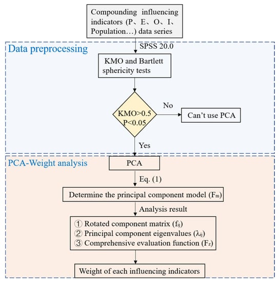 - Determine the principal component model, as defined by Equation (5):where F1, F2, ..., Fm are the m principal components obtained after the analysis, uij is the coefficient in the decision matrix when SPSS software is used for the principal component analysis, and the initial factor load fij is not the coefficient uij of the decision matrix. The relationship between fij and uij is shown in Equation (6):where fij is the initial factor load, is principal component eigenvalues; and uij is decision matrix coefficient.