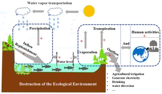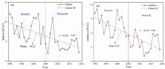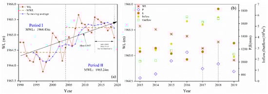 - Over the past 30 years, the total volume of EL has been in a state of dynamic positive balance. In 1990–2004, it was mainly influenced by the increase in water consumption, and the volume of EL was in a negative balanced state. In 2005–2019, it was mainly influenced by the adjustment of the operating water level of EL and the connected water replenishment project of the three reservoirs: the outflow decreased, the lake water storage increased, and the volume of EL was in a positive balanced state. Although the water volume in 2005–2019 was in a positive balance, due to the increase in evaporation and the decrease in inflow, the water volume in 2013–2019 was in a negative balance.