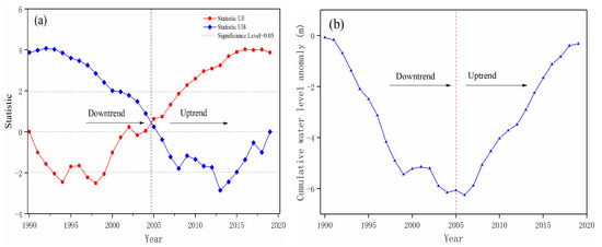 - In 1990–2019, the water level of EL rose at a rate of 47 mm/a. In 1990–2004 (before the mutation), with population growth and social and economic development, the development and utilization intensity of EL water resources increased, coupled with a decrease in water inflow, which resulted in a decrease in the WL. In 2005–2019 (after the mutation), the evaporation and outflow decreased by 8% and 52% compared with that in 1990–2004, respectively, and the water consumption of the lake decreased. Together with the increased water replenishment, this led to an upward trend of the water level, which was 0.81 m higher than that in 1990–2004. However, affected by the decrease in precipitation and the increase in evaporation and the interception of inflow by the sewage interception project, the decrease in the WL in 2013–2019 slowed the rising trend of the WL in EL in 2005–2019. It has been predicted that the WL will decrease in the future (H = 0.048 < 0.5), which was mainly related to the increase in future lake discharge (H = 0.046) and evaporation (H = 0.048). In addition, it was predicted that the future WL will show a downward trend (H = 0.048 < 0.5), which is mainly affected by the increase in outflow (H = 0.042) and evaporation (H = 0.048) in the future.