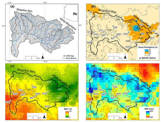 Salt River basin maps showing location of basins and sub-basins and USGS gages (a), mean annual 1 January–3 July percent snow persistence from 2001–2015 [33] and SNOTEL station numbers (b); mean annual temperature (MAT in °C) (c), and mean annual precipitation (MAP in mm) from 1929–2011 [34] (d). Inset in (a) shows study site within Lower Colorado River Basin. Dotted line within basins in (a) shows boundary between two sub-regions, White Mountains and Mogollon Rim; SAC and SAR gages are on the Salt River mainstem. SNOTEL station numbers shown in (b) correspond to station information provided in Table 2. Contour lines in (b–d) show elevation bands at 500 m.a.s.l. intervals.