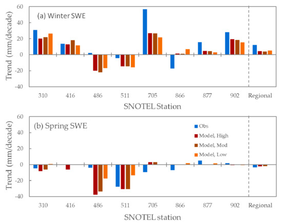 We also compared seasonal trends in observed and simulated SWE at the SNOTEL stations. Trends of simulated SWE at individual stations were generally in the same direction as observed SWE. In winter, trends in simulated SWE were in the same direction as trends in observed SWE in six of the eight stations. Trends in simulated and observed SWE in spring months were only in the same direction in three of eight sites, though the magnitudes of spring SWE trends were generally smaller than winter SWE trends. Results from the regional Kendall test, which is more resistant to outliers and missing data, showed that regional trends in simulated SWE were in the same direction and of similar magnitudes to observed SWE (Figure 2). None of the trends were significant at p < 0.05.