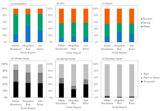 Seasonal mean percentages of annual streamflow (a), potential evapotranspiration (PET) (b), and hydrological inputs (sum of snowmelt, rain-on-snow, and rainfall) (c) summarized by White Mountain, Mogollon Rim, and Salt River regions from 1968–2011. Also shown are mean percent contributions of snowmelt, rain-on-snow, and rainfall in winter (d), spring (e), and summer (f). Seasons are winter (NDJF), spring (MAMJ), and summer (JASO).