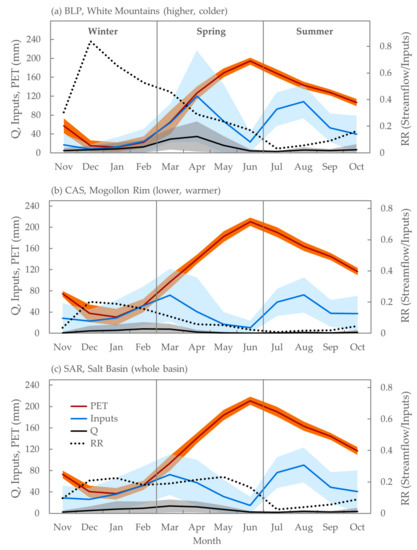 Plots of mean (lines) and standard deviation (shaded areas) of area-normalized streamflow (Q), potential evapotranspiration (PET), and hydrological inputs (sum of snowmelt, rain-on-snow, and rainfall) for Black River Point of Pines (BLP, White Mountains) (a), Carrizo Creek (CAS, Mogollon Rim) (b), and Salt River (SAR, whole basin) (c) from 1968–2011. RR is mean runoff ratios (Q/hydrological inputs) shown as dotted black lines.