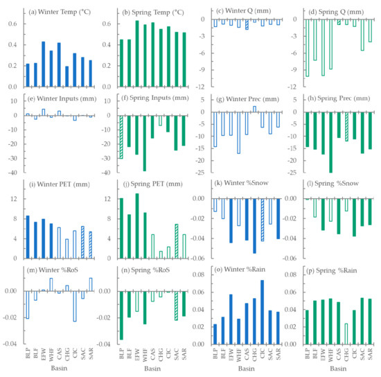Decadal trend slopes from 1968–2011 in winter and spring: temperatures (a,b); streamflow, (Q) (c,d); hydrological inputs (sum of snowmelt, rain-on-snow and rainfall) (e,f); total precipitation (g,h); potential evapotranspiration, PET (i,j); percent snowmelt (k,l); percent rain-on-snow, RoS (m,n); and percent rainfall (o,p) in Salt River basins. Units of y-axes are shown in sub-figure headings (a–p). Trends were calculated using the Mann-Kendall test [42,43], trend slopes calculated using Sen’s slope estimation [45]; filled bars show trends significant at p < 0.05; stripped 0.05 < p < 0.1; and empty bars p > 0.1. Precipitation from [34]; hydrological inputs from model developed in this study; PET from TerraClimate [38].