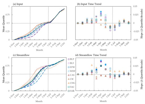 To examine potential changes in timing, we conducted a quantile analyses on daily input and streamflow. For each day, we computed the water year cumulative input and cumulative streamflow for water years starting on 1 November. Next, we computed each day’s quantile as the fraction of water year total input or streamflow on each day and compared mean quantiles at the start of each month (e.g., 1-November, 1-December, etc.). This allowed us to evaluate differences in seasonal timing between the study basins and sub-basins. As an additional analysis, we calculated flow quantiles for each day and water year at all gauges and evaluated whether the quantiles of annual flow at the start of each month have changed over time, again using the Mann-Kendall test and Sen’s slope estimator at the decadal time scale.