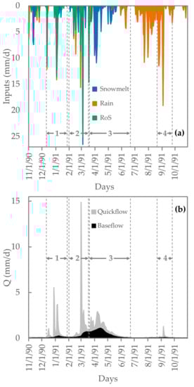 Daily snowmelt, rain, and rain-on-snow (RoS) inputs (a) and daily discharge (Q) separated into quickflow and baseflow components (b) in Black River Fort Apache (BLF) sub-basin in White Mountains from water year (WY) 1991. Numbered vertical dotted lines denote four quickflow response intervals (QRIs) identified in WY. Inputs in (a) and area-normalized streamflow components in (b) are stacked such that the width of all bands represents the total daily input and discharge, respectively.