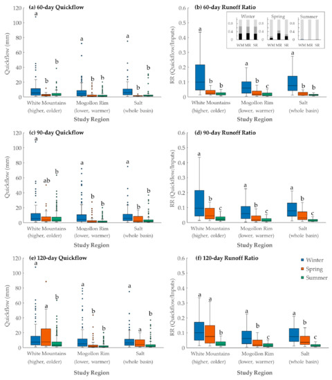 Comparison of quickflow response intervals (QRIs) grouped by season and regions from 1968–2011 for 60-day (a,b), 90-day (c,d), and 120-day intervals (e,f). Left panels show area-normalized quickflow magnitudes (mm); right panels show runoff ratios (Quickflow/hydrological-inputs). Boxes show interquartile range, horizontal line is median, whiskers are 10 to 90 percentiles, dots are outliers (RR outliers not shown). a, b, c letters above individual bars indicate significant differences at p < 0.05 using the Mann-Whitney U-test. Inset panel in (b) shows percent hydrological inputs (black for snowmelt, grey for rain-on-snow, light grey for rainfall) in White Mountains (WM), Mogollon Rim (MR), and Salt River (SR) regions for 60-day QRIs in winter, spring, and summer.