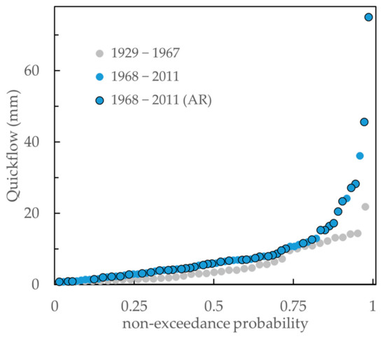 Comparison of winter QRIs from an earlier period (1929–1967) to the study period (1968–2011) in the Salt River region (data not available for sub-regions) showed that short-duration (60-day) winter responses in recent decades were significantly larger than winter responses in the earlier period (Figure 9). Winter responses were nearly 2-fold larger and became more frequent in the late time period, with an average of 1.6 responses occurring every year, compared to one per year in the earlier time period. QRI magnitudes in other seasons or durations were not different in the two periods (Table S3). As shown for BLF in WY 1991, many of the high-magnitude streamflow response periods overlapped with known occurrences of atmospheric rivers. While not all atmospheric rivers were associated with high-magnitude responses, they did account for 75% of the largest winter streamflow responses (exceedance probabilities at or above 0.75) from 1979–2011 (Figure 9). The potential influence of atmospheric rivers on high-magnitude winter QRIs may be an underestimate because atmospheric river data were only available from 1979–2011.