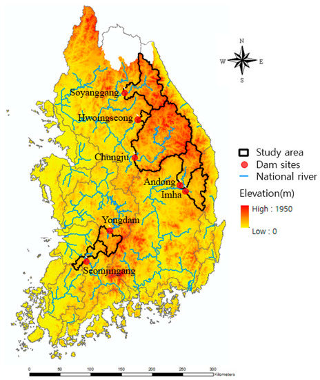 The seven sites, namely Seomjingang-dam, Soyangang-dam, Andong-dam, Yongdam-dam, Imha-dam, Chungju-dam, and Hwoingseong-dam, located in various parts of South Korea, were chosen for this study (Figure 1) as they have extensive flood data that are not likely to be influenced by upstream anthropogenic activities. The dams are located on the major rivers of Korea, with three of them located within the Han River basin, two located within the Nakdong River basins, one in the Geum River basin, and the remainder in the Seomjingang River basin. The dams were built to serve multiple purposes, such as flood control, water supply, and hydropower generation. Each reservoir of the studied dam sites set the restrict water level (RWL) for flood control. The excessive water volume above RWL should be released during the specific flood season from 21 June to 20 September.