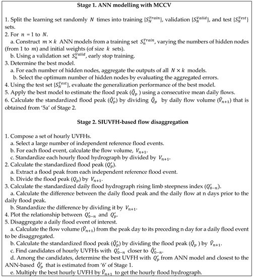 Therefore, the aim of this paper is to propose a coupling approach of the ANN-based IPF estimation method and the steepness-index-based flow disaggregation method for improving the rising-limb hydrograph on an hourly time scale. To this end, we first construct ANN models that can estimate hourly peak flows using mean daily flows for seven dam sites in South Korea. The optimal network structure for each site was determined based on the Monte-Carlo cross-validation procedure, and the performance was evaluated via comparison with several empirical formulas for IPF estimation. A case study is also illustrated to investigate the improvement of the previously developed SIUVFH-based flow disaggregation method using the ANN-based peak estimation as an indicator of the SIUVFH method.