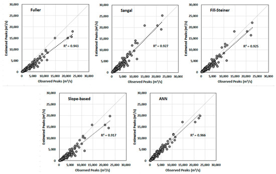 Figure 4 shows the scatter plots of the estimations from the ANN model and the four empirical formulas with the observed peak flows. The peak flow data used at seven sites were plotted together. In general, the estimated flood peaks using empirical formulas were more deviated from the observed peaks compared to the ANN model’s estimations. The regression line slope estimated by Sangal’s formulas was closer to 1 when compared with the others but showed wider dispersed points. The ANN results showed narrowly dispersed points along the regression line with the best performance in terms of the highest R2 of 0.966. The present study also confirms the high ability of the ANN model for the estimation of the instantaneous peak flow from the MDF data.