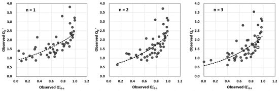 The proposed methodology combining an ANN model for peak flow estimation and the SIUVFH for flow disaggregation to generate a hydrograph on an hourly scale was applied to the Imha-dam site. As presented in Table 1, the 47 flood events for the Imha-dam sites were used as independent reference hydrographs. Each hydrograph was further standardized by dividing its hourly flows by the n+1 day flow volume to obtain the hourly unit volume flood hydrograph (UVFH). Then, the standardized hourly flood peak and the standardized daily flood hydrograph rising-limb steepness index were calculated using Equations (5) and (6) for all UVFHs. The relationships between and for different n-days are presented in Figure 5.