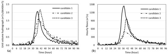 Candidates of the observed hourly unit volume and actual hydrographs at the Imha-dam. (a) unit volume hydrograph; (b) actual hydrograph.