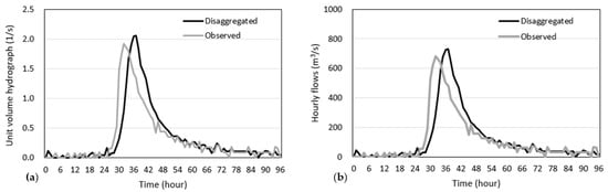 Comparison of the observed and disaggregated flows at Imha-dam. (a) unit volume hydrographs (b) scaled hydrographs.
