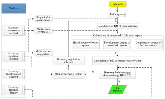 The paper was organized as follows. In the first section, we introduced the main research methods of harmony theory. Then, the framework showing the steps and the relationships between methods used in this study was then described for evaluating and regulating HWR. Finally, the case study area of the Henan Province was introduced. The results for the Henan Province as the case study were summarized in Section 3. Conclusions were listed in Section 4. The results of this study can provide insight into the comprehensive management of water resources in Henan Province and other similar regions.