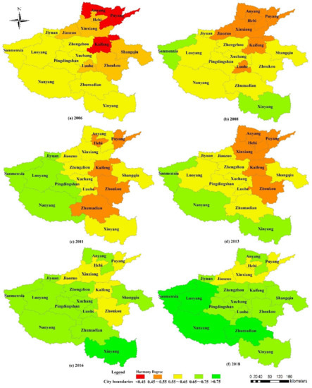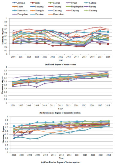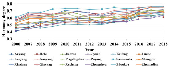 Figure 3 shows the changes of human-water harmony degree over 18 cities in Henan Province from 2006 to 2018. We select the city as a unit in this study mainly due to the limitations of available data. Because the indicators used in this study in Table 1a–c can only obtained from the government websites with the city units. Otherwise, there is no more detailed government public data available. In addition, the interpolation method will bring greater uncertainty, although they can obtain a finer available data. Therefore, to ensure the accuracy of this research, we chose the city as the research unit. However, if finer mesh-based data can be obtained, our method can be applied to the study of human-water relationships at a more refined spatial scale.