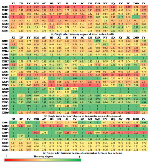 Finally, the harmony degree of humans and water was calculated by integrating the harmony degrees of the three dimensions, as follows: