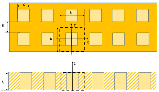 One class of possible materials to consider in this application are specific hydrogels, recognizing that such materials can satisfy several demands on the storage device. The influx of water into a hydrogel layer must be fast enough to match the influx of rainwater, which imposes certain restrictions on the geometry of the device. Lundström et al. [8] considered several materials with diffusion coefficients ranging from to [9,10,11]. To match the influx of water, a large area of contact between the absorbing material and the water is helpful. Therefore, absorbing material in a grid arrangement with water entering into square cells of cross-section b × b and depth H, with a surrounding region of absorbing material, was chosen. The whole geometry can then be represented by a repeating arrangement of square cells of the absorbing material of cross-section and height H, according to Figure 2.