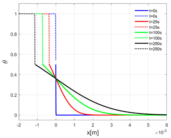 As an example, in Figure 4 the development of the water content is plotted as a function of at various times. Also note the position of the free boundary interface moving toward negative into the domain of pure water. The thickness of the boundary layer grows as and, therefore, depends on the diffusion coefficient , which for the case shown in Figure 4 is .