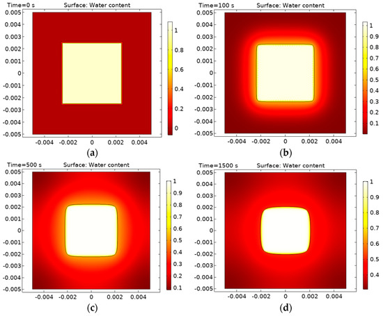 Before we consider the modification of the results from [8], including the effect of swelling, we compare, for the purpose of verification of the numerical solution, the water content at short times for the case Down3 with the analytic solution in Section 2. In Figure 5 the numerical solution obtained in the region is shown. Comparing with Figure 4 it is seen that there is a qualitative agreement for short times, which is reasonable since the analytical solution in the application to the full SPB geometry is expected to be valid only in the region, where the boundary layer thickness is much smaller than the characteristic dimensions of the SPB geometry, i.e., B, b, and H.