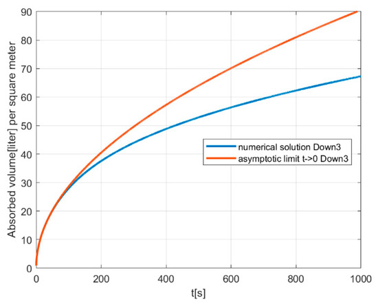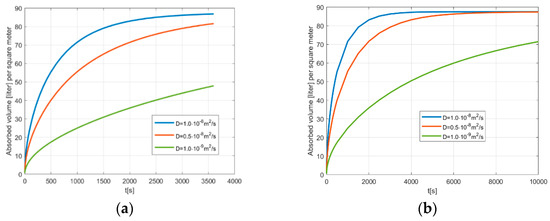 The dependence of the absorbed volume on the diffusion coefficient is presented in Figure 10a,b for the case Down3. According to the analytic solution in (15), the growth of the volume captured scales initially as , which seems to be the case also in the numerical solution. However, the maximum volume captured is the same and does not depend on the diffusion constant. For smaller diffusion coefficients it only takes longer times to reach the maximum, as seen in Figure 10b.