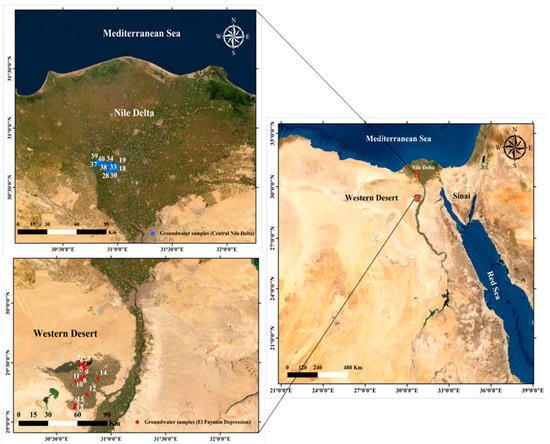 Location map of the El Fayoum depression in the Western Desert (red points) and the Central Nile Delta (blue points) and their sampling points.