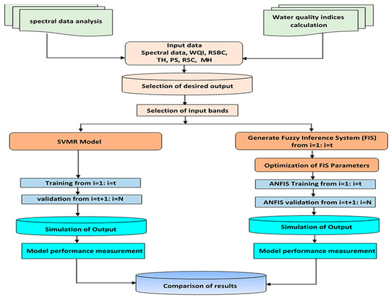 Thus far, the prediction of IWQIs using adaptive neuro-fuzzy inference system (ANFIS) and SVMR models based on spectral reflectance bands has not been addressed. Only one study that we are aware of has focused on predicting the drinking WQI of surface water using the SVMR based on spectral reflectance indices (SRIs) [44]. Additionally, Xing et al. [28] used a partial least-squares regression (PLSR) and extreme learning machine to predict the TH in sewage water using the entire range of spectrum wavebands (350–2500 nm).