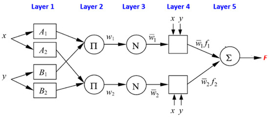 If the membership functions of the fuzzy sets Ai and Bj are correspondingly and , the five layers that incorporate ANFIS will be formulated as discussed below.