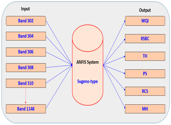 Each square-illustrated layer is termed adaptive, and its values are typically changed while system training is conducted. Conversely, the layer epitomized by the circle remained invariable before, during, and after the training is complete. Figure 3 represents the network used in this study and comprises select bands as inputs, as well as one output membership function for the desired index (different irrigation water quality variables).