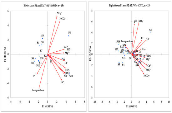Additionally, the PCA was applied for the 11 physiochemical parameters to confirm the results of the FA. The primary objective of the PCA is to classify the different physiochemical parameters into major components such that the parameters that are their vectors, adjacent or parallel to each other and with a small angle between them, signify the strength of their reciprocal association. By contrast, the divergence of the vectors of the parameters expresses weak relationships between them. Based on the angles between the vectors of the parameters in the biplot of the PCA, the 11 physiochemical parameters were divided into three and four groups in the WD and CND regions, respectively (Figure 5). The first of these included K+, Ca2+, Mg2+, Na+, Cl−, SO42−, and TDS from the WD region, whereas that for the CND region included Ca2+, Mg2+, SO42−, HCO3−, and TDS. The second group, which only appeared in the CND region, comprised K+, Na+, and Cl−. The NO3− with HCO3− in the WD region and with a pH in the CND region was located in the third group. The fourth group contained pH and temperature in the WD region but only temperature in the CND region (Figure 5).