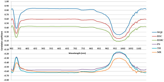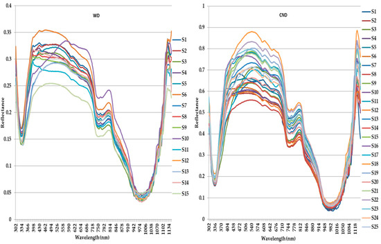 Figure 6 displays the behavior of the spectral reflectance signature of the different groundwater samples collected from the two regions of between 302 and 1148 nm. The figure shows that there are obvious differences in the shape of the spectral reflectance curves between the samples. However, the spectral reflectance of the groundwater samples from the CND region was higher than that in the samples obtained from the WD one. Additionally, the figure also shows that the spectral reflectance curves of the two regions reveal three reflectance deep troughs around 320–340, 740–780, and 950–1000 nm wavelength regions and three reflectance peaks around 400–700, 780–820, and 1100–1148 nm wavelength regions (Figure 6). Furthermore, clear differences in the spectral reflectance between the groundwater samples in both regions were considerably large in the 302–318, 350–700, 750–900, and 1074–1148 nm wavelength regions. These results indicate that the obvious differences in physiochemical characteristics between the groundwater samples influenced the variations in the curves of the hyperspectral reflectance at different wavelength regions. Therefore, these results further suggest that it is possible to evaluate the parameters related to IWQIs in terms of the spectral characteristics of the water surface in these wavelength regions.
