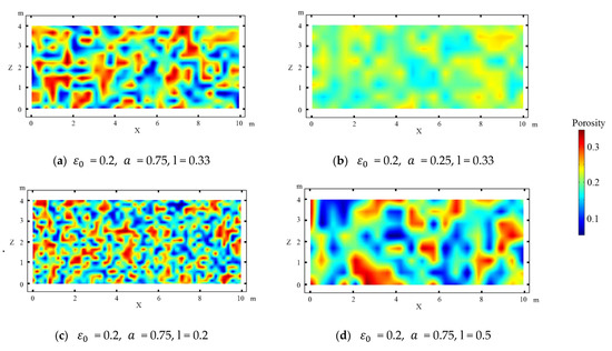 Initial porosity values were generated using the equation , where is the mean value of the porosity and is a random number that is uniformly distributed in the interval []. The magnitude of the porosity heterogeneity is defined as . In this study, was 0.2. was used as large heterogeneity and was used as small heterogeneity. The permeability values were calculated using the Carman–Kozeny equation [44,49]. Parameter l was used to represent the characteristic length of the porosity heterogeneity. Unless stated otherwise, l was used as the grid size for the model generating the initial porosity distribution. Figure 1 shows the porosity distribution with different magnitude of the heterogeneity and characteristic lengths.
