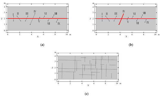 Topology of intersecting fractures used for the numerical models. Red lines indicate fractures with an aperture of 1.1 × 10−5 m. (a) Intersecting fracture set 1 and set 3, (b) intersecting fracture set 2, (c) fracture network model.