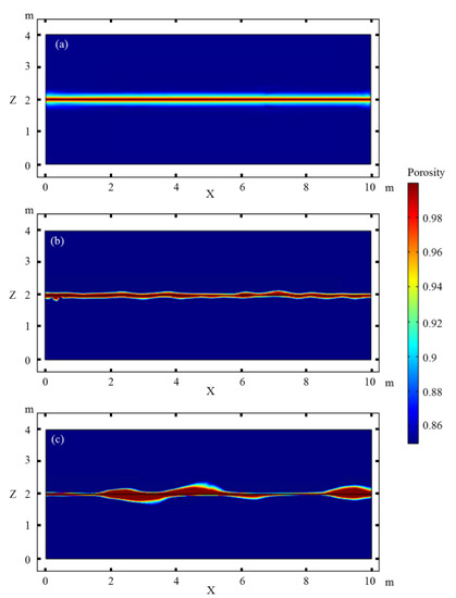 Effect of the magnitude of matrix porosity heterogeneity on the dissolution along the horizontal fracture. (a) Homogeneity, (b) weak heterogeneity, (c) strong heterogeneity.