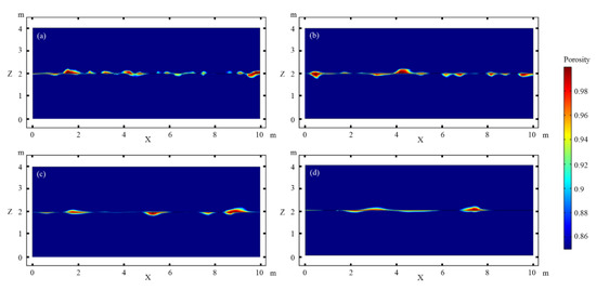 Figure 4 shows the influence of the characteristic length of the matrix porosity heterogeneity on the fracture dissolution and the formation of cavities along the fracture. The cavities are distributed along the fracture, but the sizes and shapes of the holes significantly differ. When the characteristic length is small (Figure 4a,b), the size of the cavities is small, with a maximum length of 0.9 m and maximum height of 0.2 m, and the extended length of cavities along the long axes is slightly larger than the short axes. When the characteristic length is large (Figure 4c,d), the cavities are larger and flatter, with a maximum length of 1.7 m and maximum height of 0.14 m, and the extended length of cavities along the long axes is significantly larger than the short axes. Although the cavities are smaller when the characteristic length is smaller, the number of holes is larger. The opposite is true for a larger characteristic length.