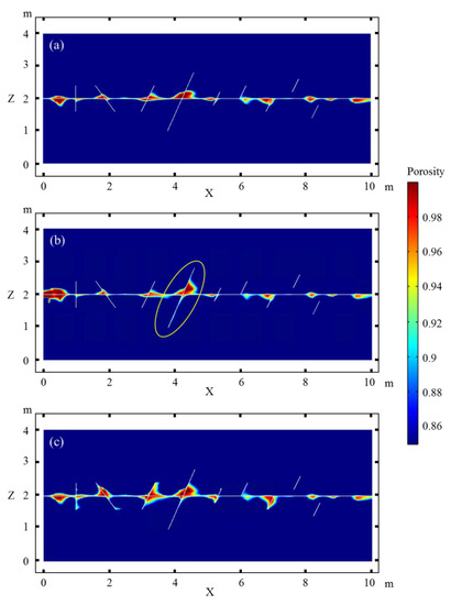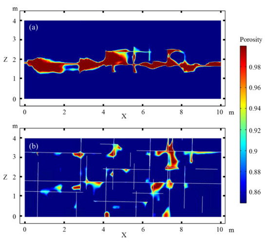Figure 7 shows the simulation results for the porosity distribution at an injected pore volume (PV) of 7 PV. When the horizontal flow dominates the system (Figure 7a), dissolution mainly occurs along the horizontal fault/fracture, especially at the intersection of vertical and horizontal faults/fractures. The preferential flow caused by the vertical fissures allows the occurrence of dissolution pores and caves far away from the horizontal fault/fracture. Because of the effect of the matrix heterogeneity, not all matrix pores near the vertical fissures significantly interact with horizontal faults/fracture changes. When the fluids are injected through the vertical fractures (Figure 7b), the matrix porosity along most of the vertical fractures notably increases due to dissolution, especially that interacting with the upper boundary of the domain. The major axis of the caves tends to spread along the vertical y-axis. Dissolution around the intersection of the vertical and horizontal fractures is more likely to form larger caves. Similarly, the matrix heterogeneity limits the extension of the pores and caves when the initial porosity and permeability are poor and the dissolution caves show a T-shaped spread, whereas the dissolution has a much more widespread effect when the matrix is more permeable.