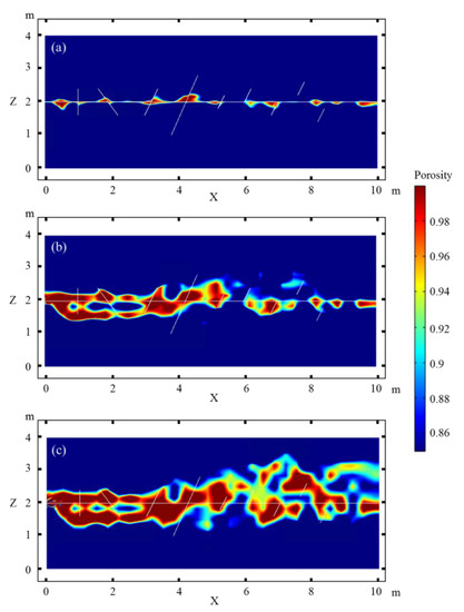 Figure 6 shows the formation of caves along the horizontal and the intersecting fractures for different magnitudes of the matrix permeability. The average permeability of the matrix in Figure 6b is one order of magnitude higher than that in Figure 6a, while it is two orders of magnitude higher in Figure 6c, which is close to the permeability of the cross fractures. In Figure 6a, the dissolved cavities are mainly limited to the vicinity of the joint of the horizontal and intersecting fractures and the cavities are sparsely distributed. When the average matrix permeability is increased by one order of magnitude (Figure 6b), the dissolution cavities on both sides of the horizontal fracture significantly increase in terms of the size and number. The maximum extension of cavities from the horizontal fracture reaches 0.7 m. With the increase in the matrix permeability, the effect of the fractures is weakened. This is especially notable in Figure 6c; the matrix permeability is further increased to be equivalent to that of the intersecting fractures. The domain of dissolution caves generally exceeds the intersecting fractures, with a maximum extension of cavities of 1 m from the horizontal fracture. Caves even form in the area near fractures VIII and IX, which are not connected to the horizontal fracture. In addition, with increasing matrix permeability, the caves connect and form a large cave system, which is similar to an underground river in the karst system.