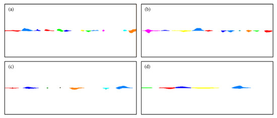Image processing results showing the cavity segmentation for different characteristic lengths. (a), (b), (c), and (d) represent the results for the characteristic lengths of 0.2, 0.33, 0.5, and 1.0, respectively. Different colors are used to visually differentiate the individual cavities.