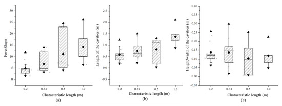 The statistical results for the characteristic parameters of the cavity shapes for different characteristic lengths are shown in Table 3. In this study, we introduced the FeretShape parameter to reflect the roundness of the cavities, which is defined by the maximum and minimum lengths (Figure 9). When the characteristic length is 0.2 m, the FeretShape ranges from 1.56 to 11.82, with an average of 4.91. The length of the cavities ranges from 0.20 to 1.24 m, with an average of 0.5 m. When the characteristic length is 0.33 m, the FeretShape ranges from 3.10 to 13.98, with an average of 6.80. The cavity length ranges from 0.22 to 1.51 m, with an average of 0.74 m. When the characteristic length increases to 0.5 and 1 m, the mean FeretShape increases to 11.16 and 14.15, respectively, and the average cavity length is 0.81 and 2.3 m, respectively. It can be concluded that the characteristic length has a significant influence on the roundness and size of the cavities. As the characteristic length increases, the FeretShape and length of the cavities increase (Figure 10a,b). The height/width of the cavities (d) is weakly correlated with the characteristic length. This is mainly due to the impact of the matrix heterogeneity. The matrix heterogeneity of different characteristic lengths differs; therefore, the average height/width of the cavities slightly varies, with an average height/width variation ranging from 0.10 to 0.14 m.