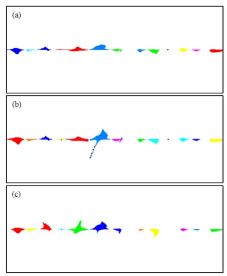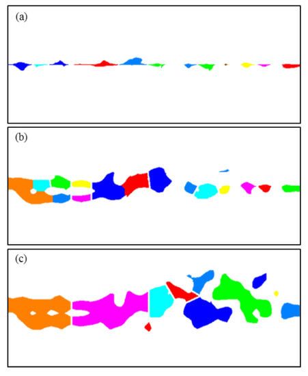 Image processing results showing the cavity segmentation for different fracture permeabilities. (a) Cross fracture set 1: the horizontal fracture aperture was set to and the cross fracture aperture was set to ; (b) cross fracture set 2: the apertures of the horizontal fracture and cross fracture IV were set to and all other cross fracture apertures were set to ; (c) cross fracture set 1: the horizontal fracture aperture was set to and the cross fracture aperture was set to . Different colors are used to visually differentiate the individual cavities.