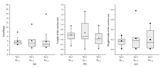 The statistical results for the morphology of the cavities with cross fractures are shown in Table 4 and Figure 12a,b. For cross fracture set 1, the FeretShape of the cavities ranges from 2.46 to 7.97, with an average value of 3.95. The cavity length ranges from 0.15 to 1.51 m, with an average of 0.65 m. The cavity width ranges from 0.019 to 0.29 m, with an average of 0.17 m. For cross fracture set 2, the FeretShape of the cavities is between 1 and 11.45, with an average value of 3.68. The cavity length is between 0.02 and 1.53 m, with an average of 0.56 m. The cavity widths are between 0.019 and 0.78 m, with an average of 0.19 m. Compared with the cross fracture set 1, the difference between the two scenarios is mainly reflected in the vicinity of cross fracture IV. The permeability of cross fracture IV in set 2 is the same as that of the horizontal fracture (1 × 10−11 m2) and the dissolution extends further along fracture IV. Therefore, the length and width of the cave near fracture IV significantly vary and the FeretShape increases to 11.45. Due to the increase in the fracture permeability, the cumulative injection volume (PV) of the cross fracture set 2 is slightly larger than that of set 1 during the same period. The cavity volume is larger (2.12% and 1.69% for sets 1 and 2, respectively). However, because the permeability of the other fractures, except for fracture IV, insignificantly changes, the average cavity dimensions (height, length, and FeretShape) are very similar.