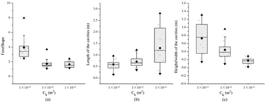 Comparison of the characteristic parameters of the pore shape for different matrix permeabilities. (a), (b), and (c) represent the statistical results of FeretShape, length of cavities, height/width of cavities with different CK, respectively.