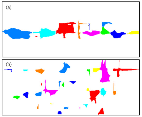 Image processing results showing the cavity segmentation for different seepage directions. (a) Horizontal flow, (b) vertical flow. Different colors are used to visually differentiate the individual cavities.