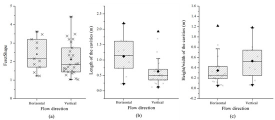 When the flow direction differed, the images of the cavity distribution in Figure 7 were post-processed and the cavities were distinguished and separated, as shown in Figure 15. The corresponding statistical results for the characteristic parameters of the pore morphology are shown in Table 6 and Figure 16. The topographic structures of the two scenarios are identical. When the volume of the injected fluid (PV) is the same, the differences between the two models reflect the hydraulic difference along the seepage directions such as the connectivity and actual preferential seepage pathways of the fluids. With respect to horizontal seepage, the volume of the dissolution holes accounts for ~9.86%, that is, it is slightly higher than that of vertical seepage (8.5%). The FeretShape ranges from 1.23 to 3.62, with an average of 2.41. The cavity length ranges from 0.23 to 2.19, with an average of 1.12 m. The width of the hole development varies between 0.065 and ~1.18 m, with an average of 0.53 m. When the seepage flow is mainly vertical, the FeretShape varies between 1.03 and 4.42, with an average of 2.11. The cavity length ranges from 0.12 to 1.93, with an average of 0.63 m. The width varies between 0.051 and 1.21 m, with an average of 0.35 m. Based on the combination with the spatial distribution of the dissolution caves corresponding to the two seepage directions in Figure 15, it can be seen that the caves are mainly distributed along the horizontal fracture when horizontal seepage is dominant and the number of caves is smaller. However, each cave is relatively large and the average FeretShape is larger. In the vertical seepage flow scenario, the caves mainly spread along multiple groups of orthogonal short and straight fractures and the number of caves is higher. However, the size and volume of the caves are relatively limited and the FeretShape of more than half of the caves is smaller than 2, leading to a smaller average FeretShape value.