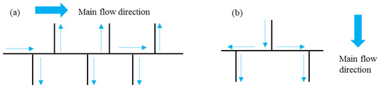 The preferential flow paths are closely related to the fracture network topology and flow direction [50]. When the main stream flows along a long fault/fracture with the majority of the flux in the horizontal fracture, as shown in Figure 17a, the secondary fractures are filled with unsaturated fluids, and dissolved mineral substances are transported to the external system through the long fault/fracture. The dissolution mainly occurs along the long fault/fracture and the local dissolution pores that formed along secondary fractures interact with the long fault/fracture. The bead-shaped wormhole or caves spread near the long fault/fracture. When the flow paths comprise a series of short fractures with similar lengths (Figure 17b), the fluids must migrate through more fractures to find a pathway with less resistance due to the lack of a single long and straight fracture acting as a preferential seepage path. The connectivity of the interacting fractures leads to dissolution in more paths and T-shaped dissolution pores or caves easily form at the intersection of the cross fractures. In contrast to the dissolution wormholes that spread along one main fracture, multiple seepage channels with dissolution phenomena can be observed in the case of the fracture network in Figure 7b and the major axis of the caves or wormholes is consistent with the vertical seepage direction. The vertical fractures developed in the right part of the model in Figure 7b, which have a better connectivity, are the optimal channels for fluid vertical seepage.