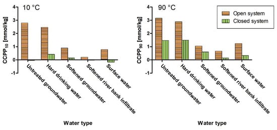 We calculated CCPP for open and closed systems at 10 °C and 90 °C for five water qualities (Figure 2).