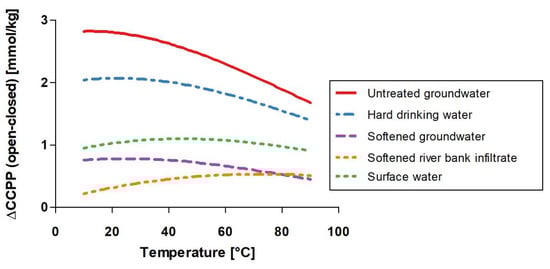 The difference between CCPP for open and closed systems was calculated as function of temperature (10–90 °C) for the five water types (Figure 3).